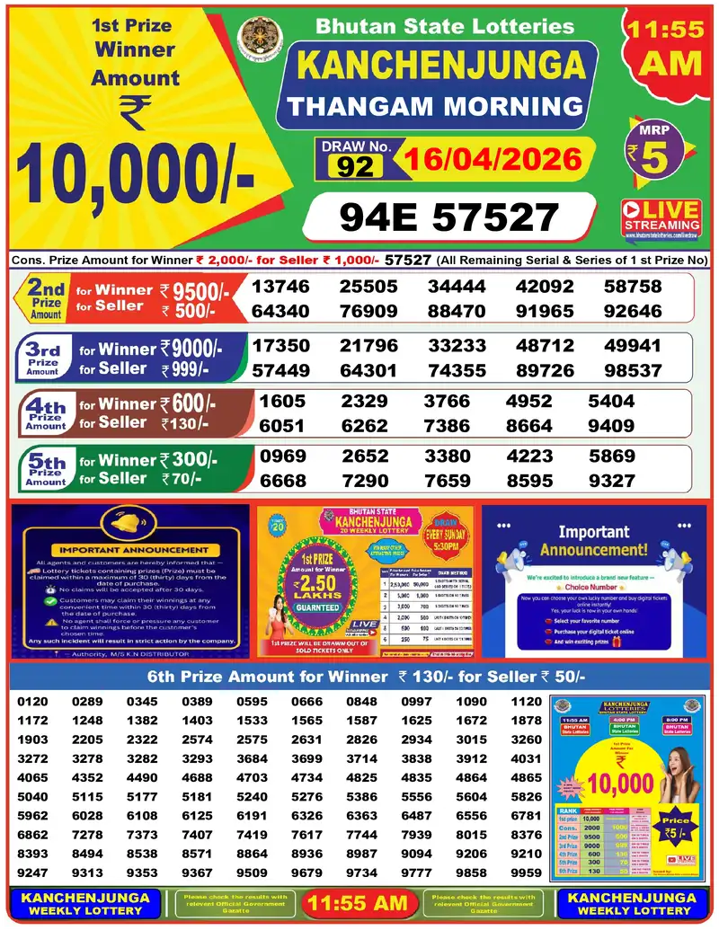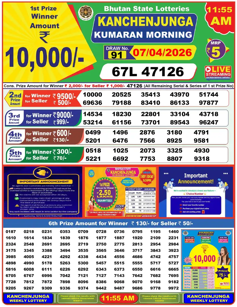 Bhutan Kanchenjunga Lottery is a government-regulated lottery with 3 daily draws at 11:55 AM, 4:00 PM, and 8:00 PM IST — running every day including Sundays. Each draw slot has a unique weekly scheme name (21 unique names per week).