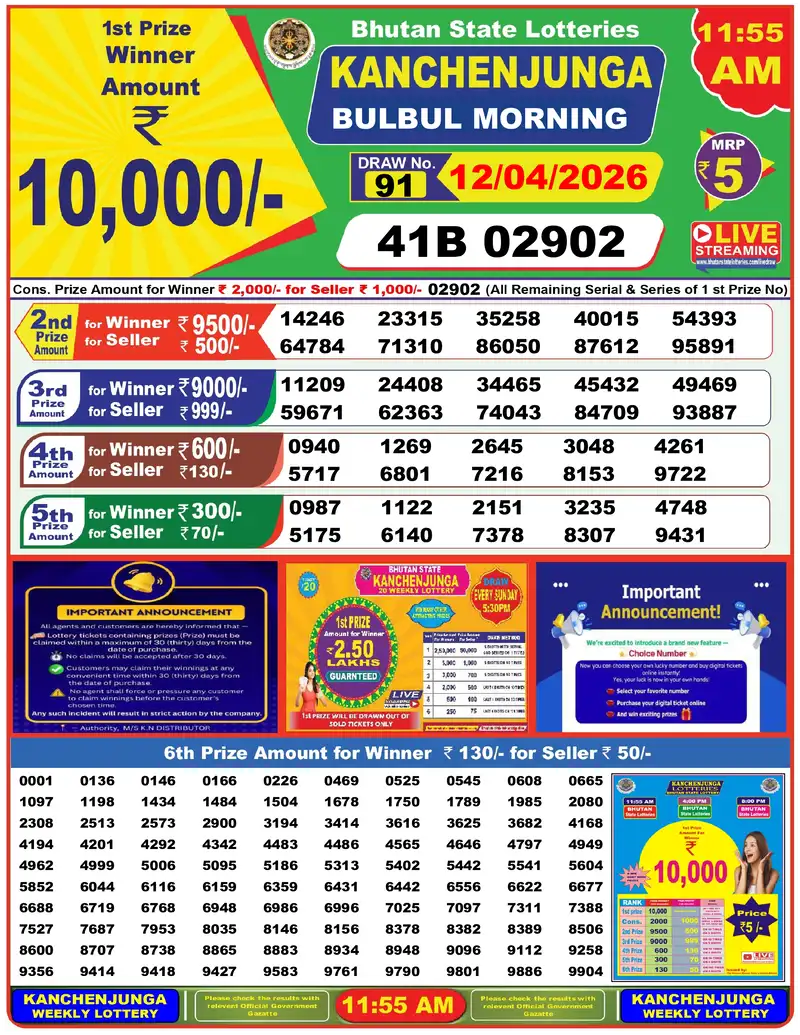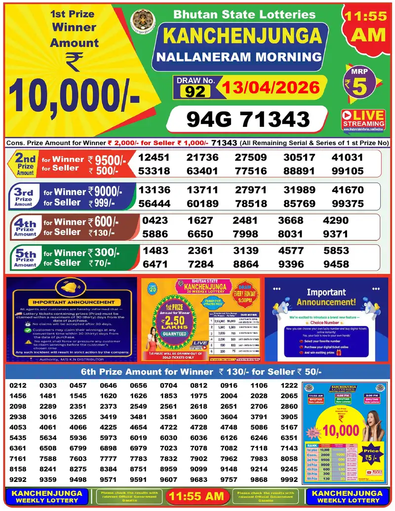 The Bhutan Kanchenjunga 11:55 AM Morning Result is the first of three daily draws. Results are published at approximately ~12:05 PM IST. Today's draw name is Thangam Morning.
