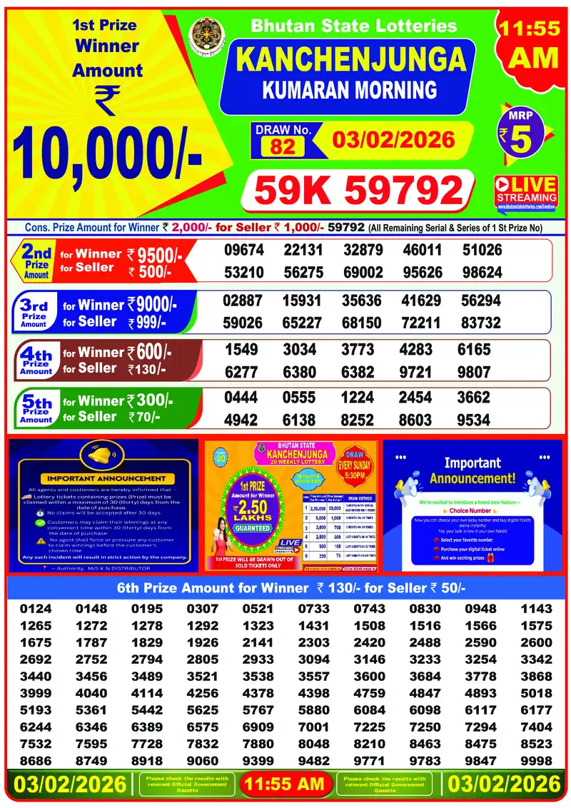 The Bhutan Lottery results for February 3, 2026 were conducted by Bhutan Lottery Limited under the authority of the Royal Government of Bhutan. Three daily draws take place: morning at 12:00 PM (Bhutan Singye Lottery), afternoon at 4:00 PM (Bhutan Kuenphen Lottery), and evening at 8:00 PM (Bhutan Druk Lottery).