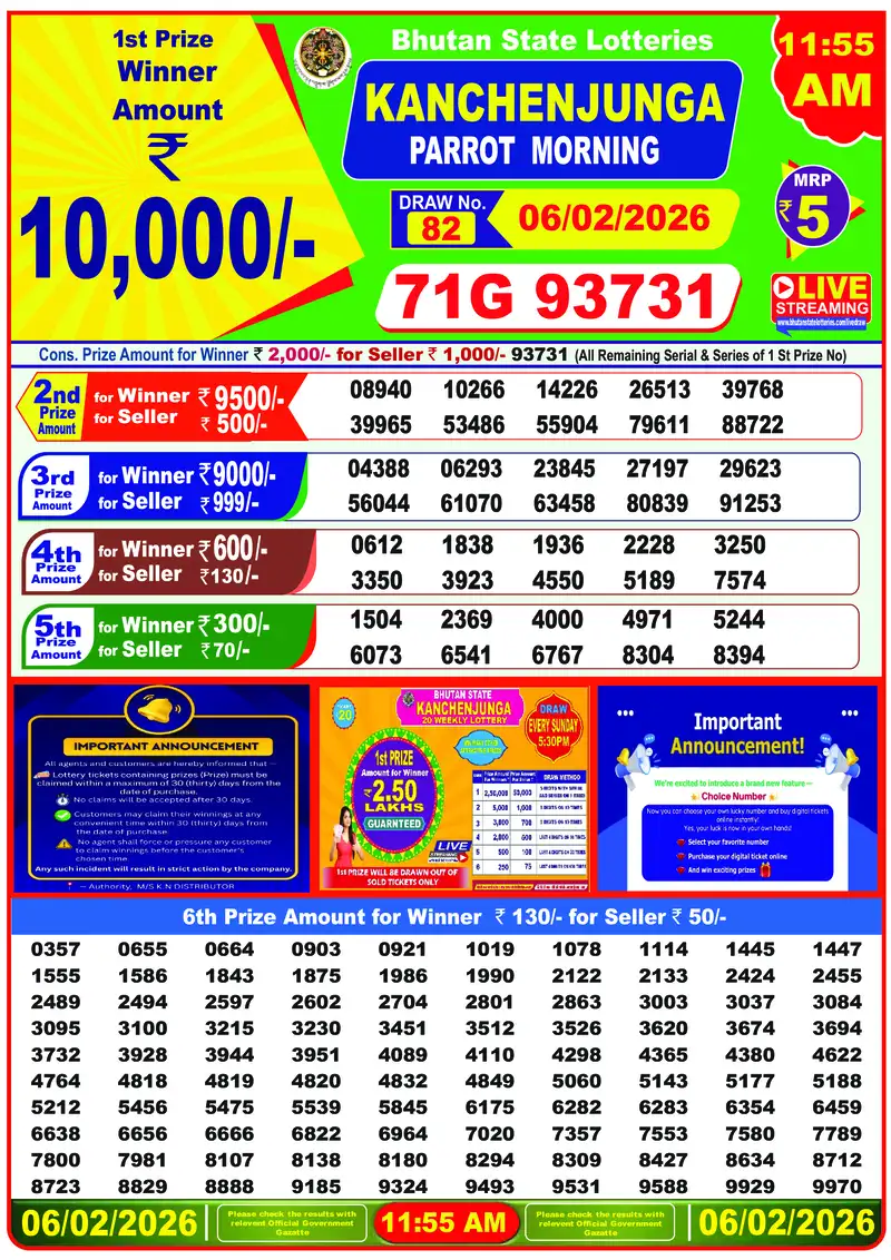 The Bhutan Lottery results for February 6, 2026 were conducted by Bhutan Lottery Limited under the authority of the Royal Government of Bhutan. Three daily draws take place: morning at 12:00 PM (Bhutan Singye Lottery), afternoon at 4:00 PM (Bhutan Kuenphen Lottery), and evening at 8:00 PM (Bhutan Druk Lottery).