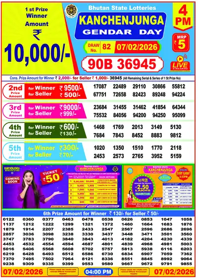 YesterdayComplete Bhutan Lottery Yesterday 4PM Afternoon Draw result for 01.03.26. Yesterday's draw was BENEFIT DAY organized by Bhutan Lottery Limited. First prize winner received ₹10,000.
