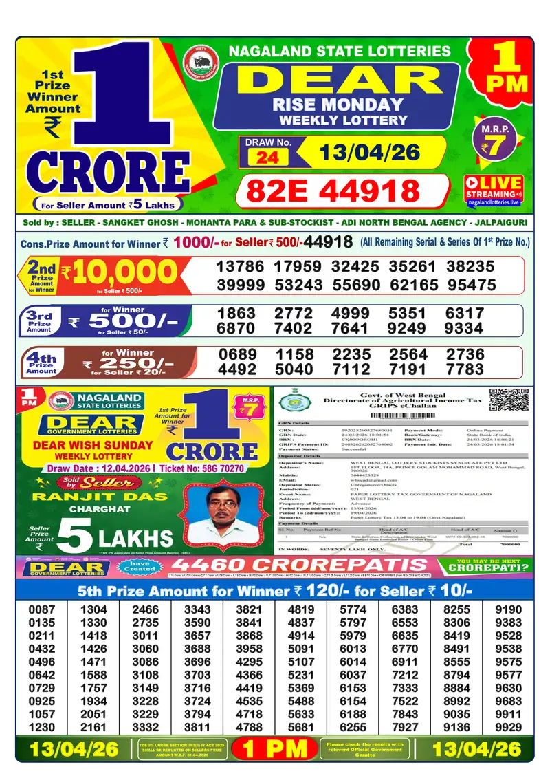 Dear Lottery Result 13 April 2026