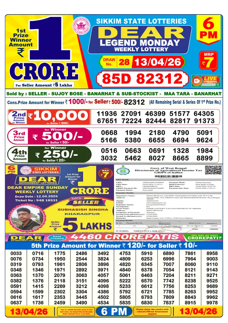 Dhankesari Lottery 1PM · 6PM · 8PM draw results for 13 April 2026