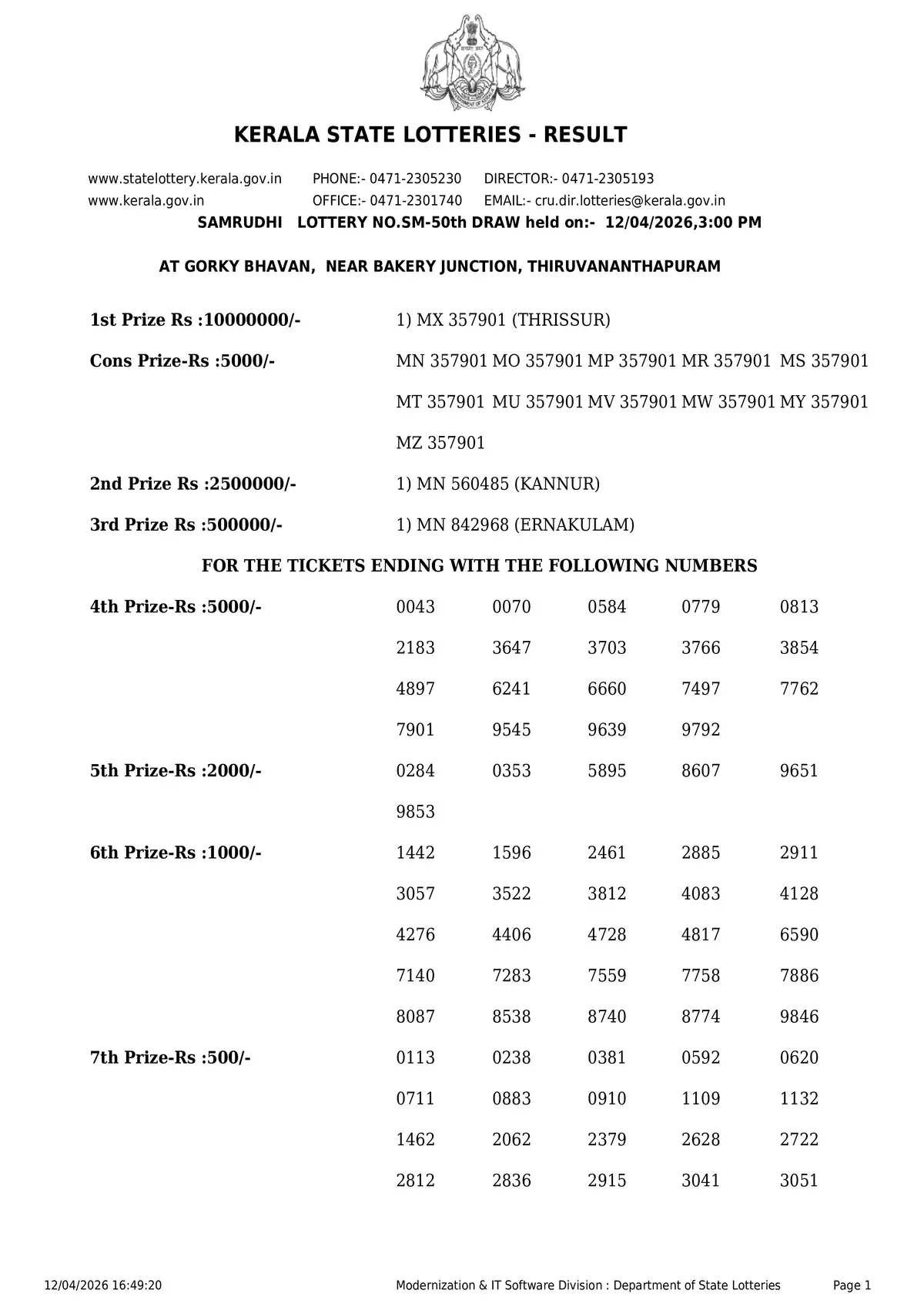Kerala Lottery Result 12 April 2026 — SAMRUDHI(SM-50)