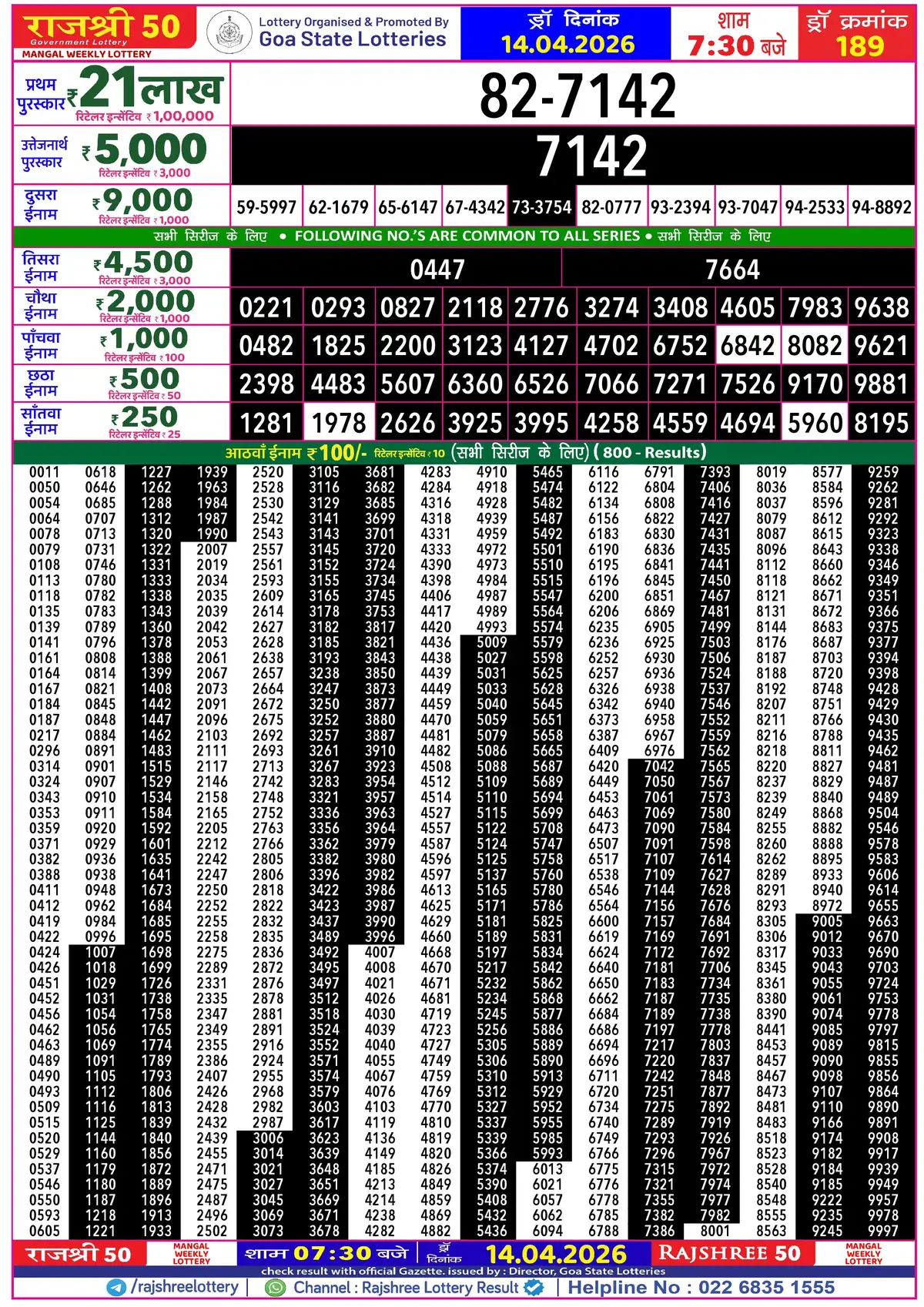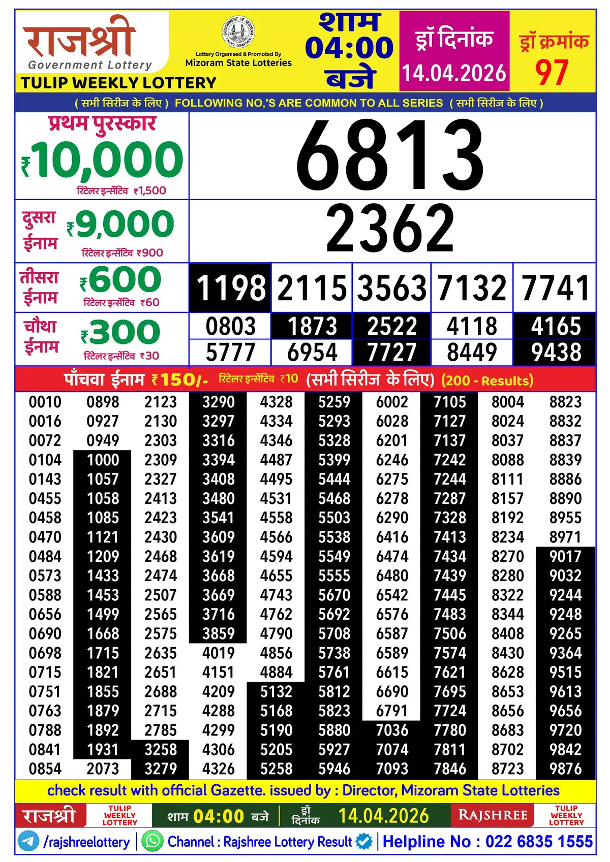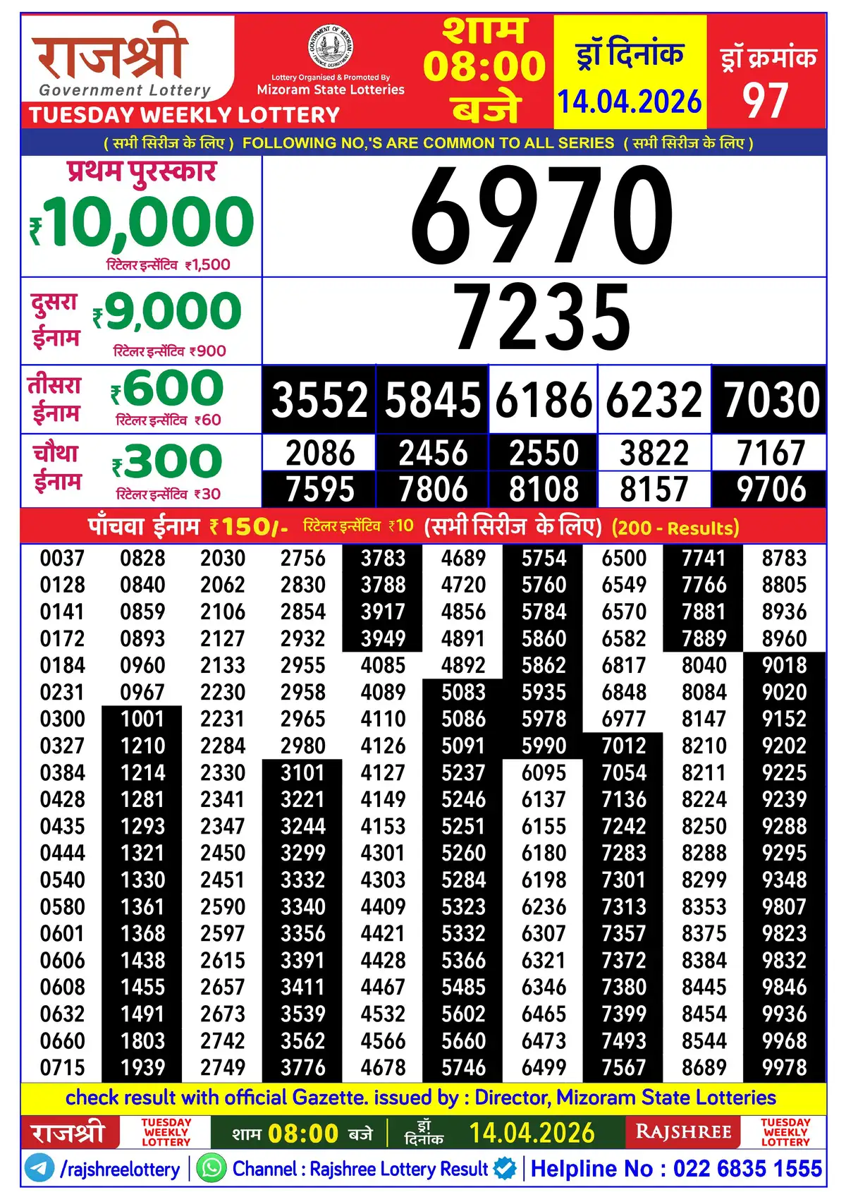 Rajshree Lottery Result 14 April 2026 — All Draws